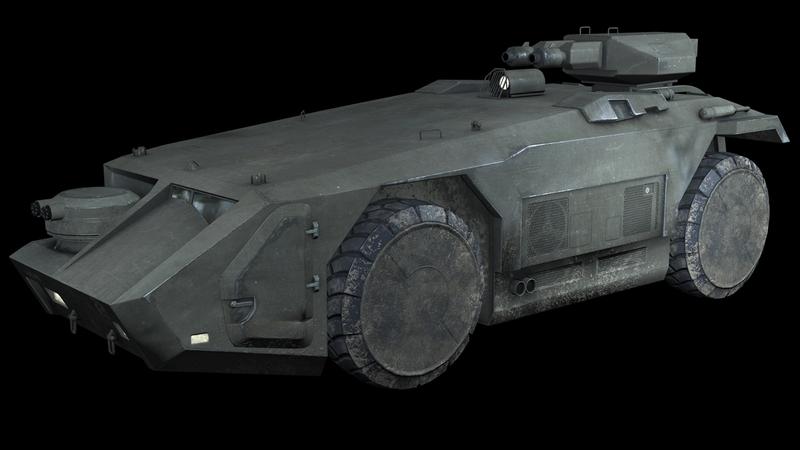APC miało zwarty i pozbawiony wystających elementów kształt spłaszczonego pudła z czterema dużymi kołami. Na lekko ściętym przodzie pojazdu umieszczone było podwójne działko, mogące wykonywać obrót o 180 stopni. Prócz niego transporter posiadał składaną wieżyczkę wyposażoną w podwójne działo, mogącą złożyć się z tyłu pojazdu podczas nieużywania. Minimalną obsługę APC stanowił kierowca oraz operator działka. Transporter mógł pomieścić w sobie jeszcze 12 pasażerów. W jego wnętrzu mieściła się dodatkowa amunicja, pomoc medyczna, sprzęt oraz automatyczne działka maszynowe typu Sentry-gun.
