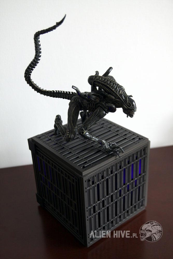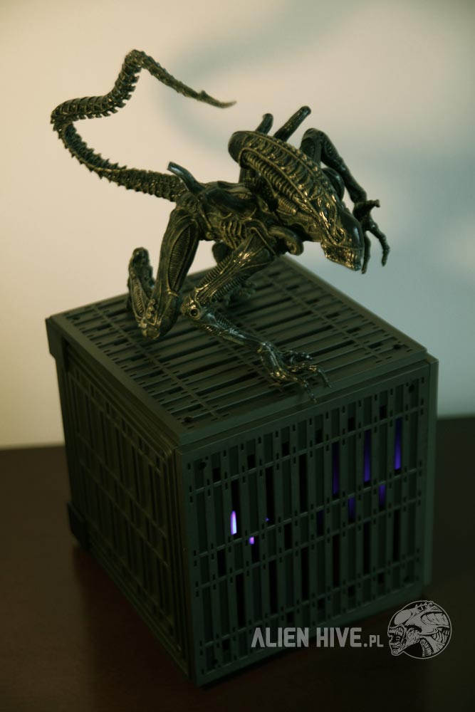 Niestety w takim, boksowym ustawieniu jaki wybrałem, dość słabo sprawdza się załączona w zestawie lampka, która daje lekką, niebieska poświatę. Aby dobrze ona oświetlała czy to panel czy Ksenomorfa, trzeba ją postawić bardzo blisko oświetlanego obiektu. W mojej koncepcji, gdy ustawiałem ją pod Ksenomorfem – psuła wrażenia wizualne. Ostatecznie włożyłem ją do środka boksu. Światło lampki jest zbyt słabe, aby wyraźnie przebić się przez wąskie szpary w panelach, ale ta lekka poświata dodaje atrakcyjności i przestrzeni kwadratowej bryle.