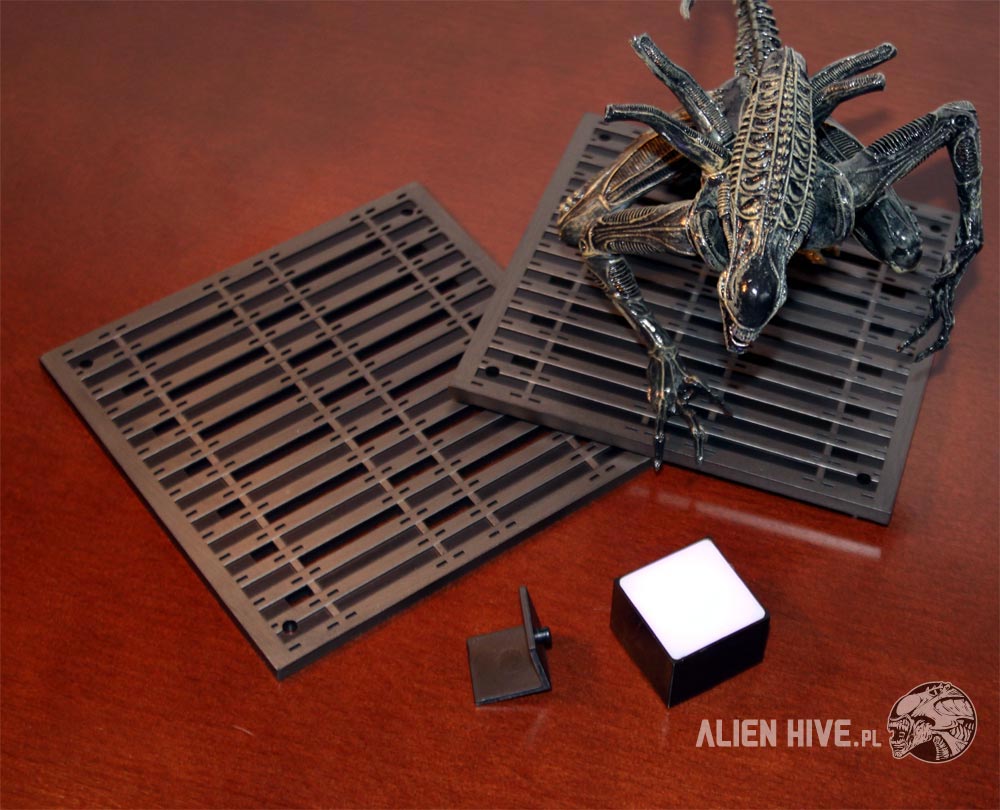 We wnętrzu pudełka kryje się plastikowa forma, która doskonale zabezpiecza części figurki oraz prosta instrukcja obsługi. Jak się okazało osobno zabezpieczone są głowa Ksenomorfa oraz cztery kolce grzbietowe. W odrębnym małym, kartonowym pudełku znalazłem wszystkie pozostałe elementy zestawu – 6 sztuk kwadratowych, plastikowych panelów, masę łączników do różnej konfiguracji panelów oraz niewielką lampkę LED, świecącą niebieskim, delikatnym światłem.