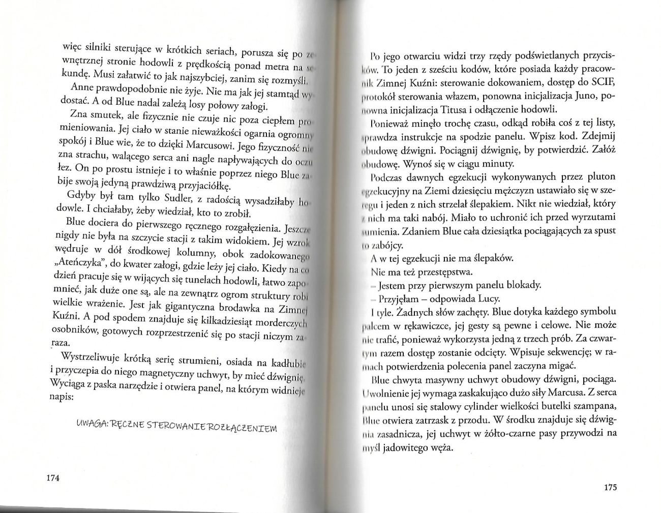 Ta książka jest ciężka jak 100 zim. Nie da się jej czytać. Jakieś takie krótkie, urywane zdania (przynajmniej w polskiej wersji językowej). Trochę jak scenariusz, a trochę jak książka dla dzieci. I te spolszczenia nazw wlasnych, np. projektów realizowanych w laboratoriach: Różany Orzeł, Srebrzystyśmiech, Lśniącą Struktura (to akurat projekt związany z hodowlą Obcych), to brzmi karykaturalnie, jak Bilbo Bagosz z Bagoszna. Po przeczytaniu 3 innych książek z serii (Wyjście z cienia, Morze boleści, Rzeka cierpienia), ta jest po prostu niesamowicie ciężka do czytania. Na temat fabuły się nie wypowiadam, bo przebrnąłem tylko (aż?!) przez 1/5 książki. To będzie chyba pierwsza książka od dawna, której czytanie zakończę po zmęczeniu 70 stron. Nie polecam.