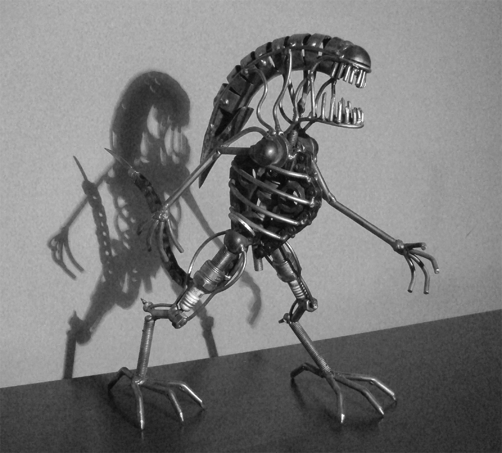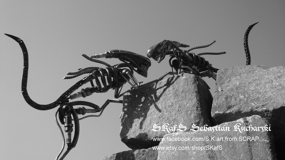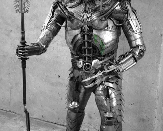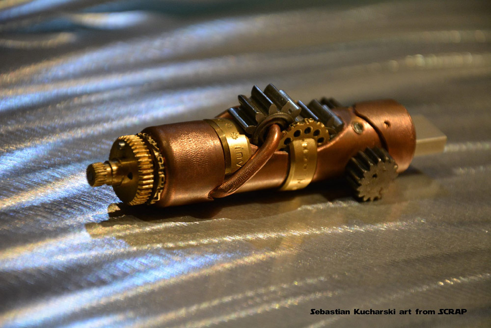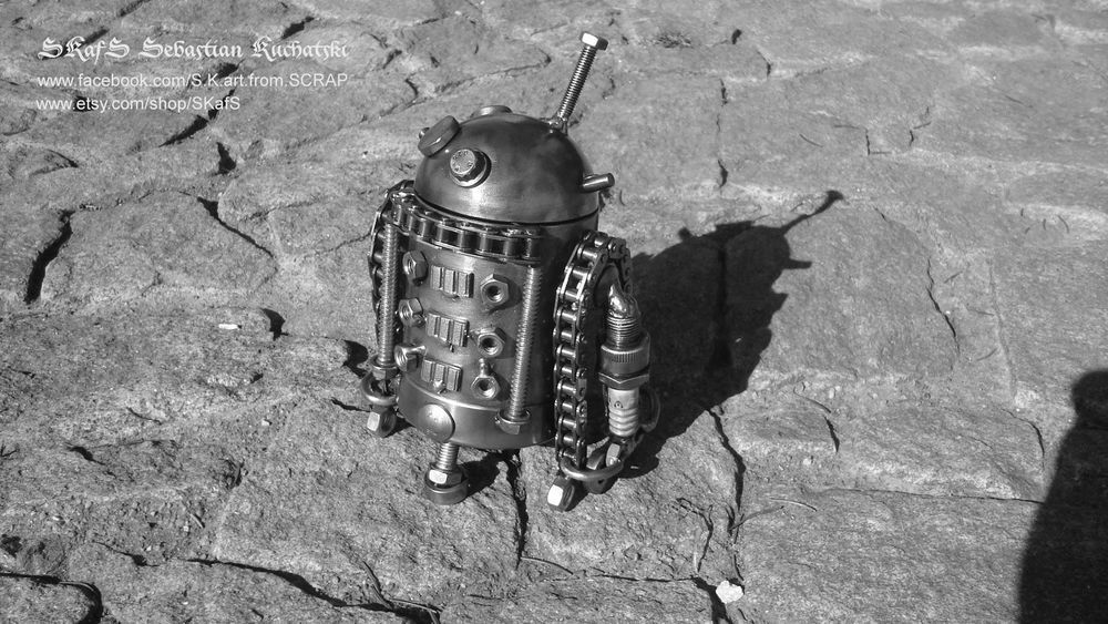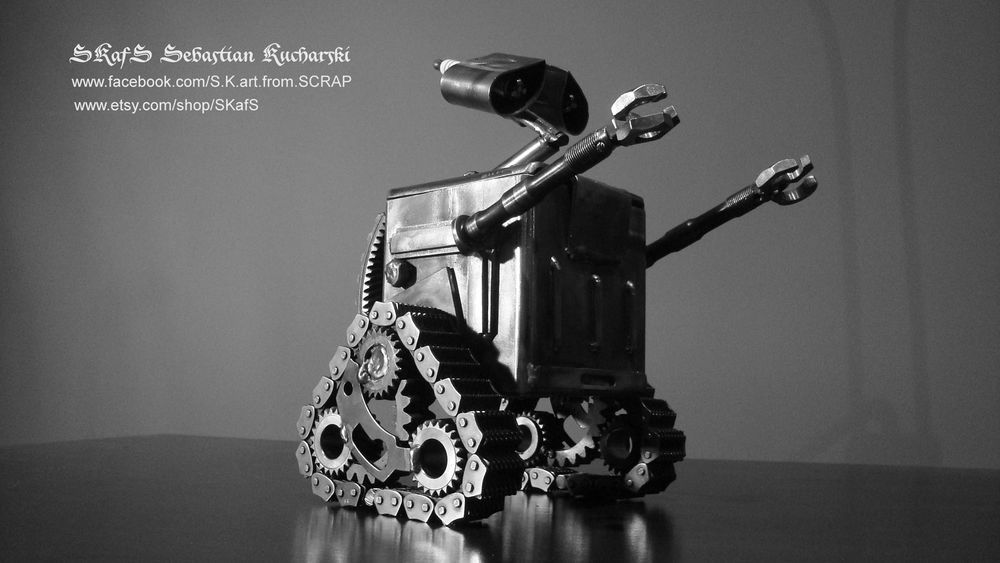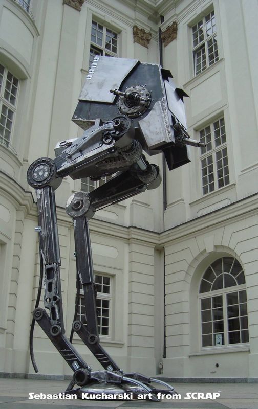 Mamy już w naszej galerii grafiki, obrazy, rysunki i płaskorzeźby. Przyszedł czas na ciężkie rzeźbiarstwo. Ciężkie, gdyż mowa o rzeźbach powstałych z metalu, zębatek i części wszelakich, które można znaleźć w każdym garażu, czy na złomowisku. Dlatego też ten typ prac i sztuki określany jest mianem scrap sculptures, czyli po prostu rzeźby ze złomu. Mistrzem w tej dziedzinie jest Sebastian Kucharski, który rozsławił swoją Fabrykę Robotów na cały świat.