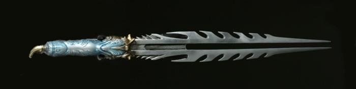 Rękojeść wykonana jest z kości Ksenomorfa, pokrytej cienką warstwą błękitnej emalii oraz licznymi zdobieniami. Całość noszona jest w pochwie przyczepionej do jednego z nagolenników.